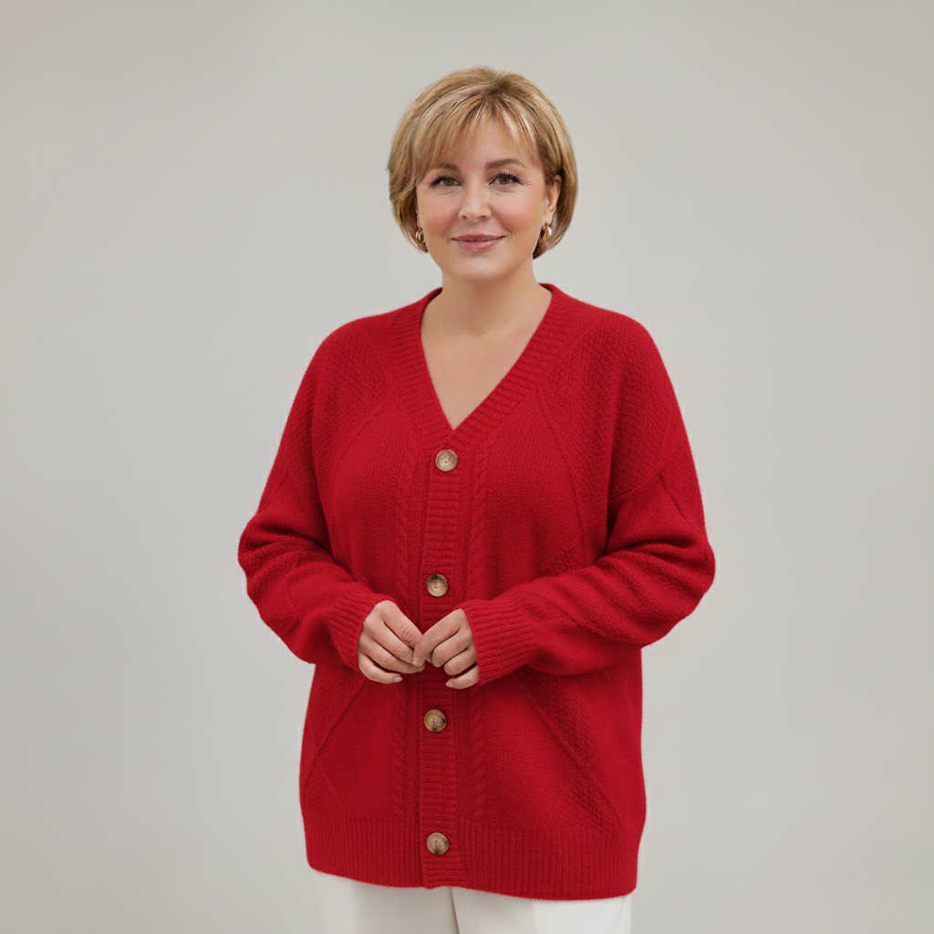Crafted in a chunky cable-knit fabric, this cardigan is cozy and breathable. The material provides warmth while staying soft and flexible for everyday comfort.