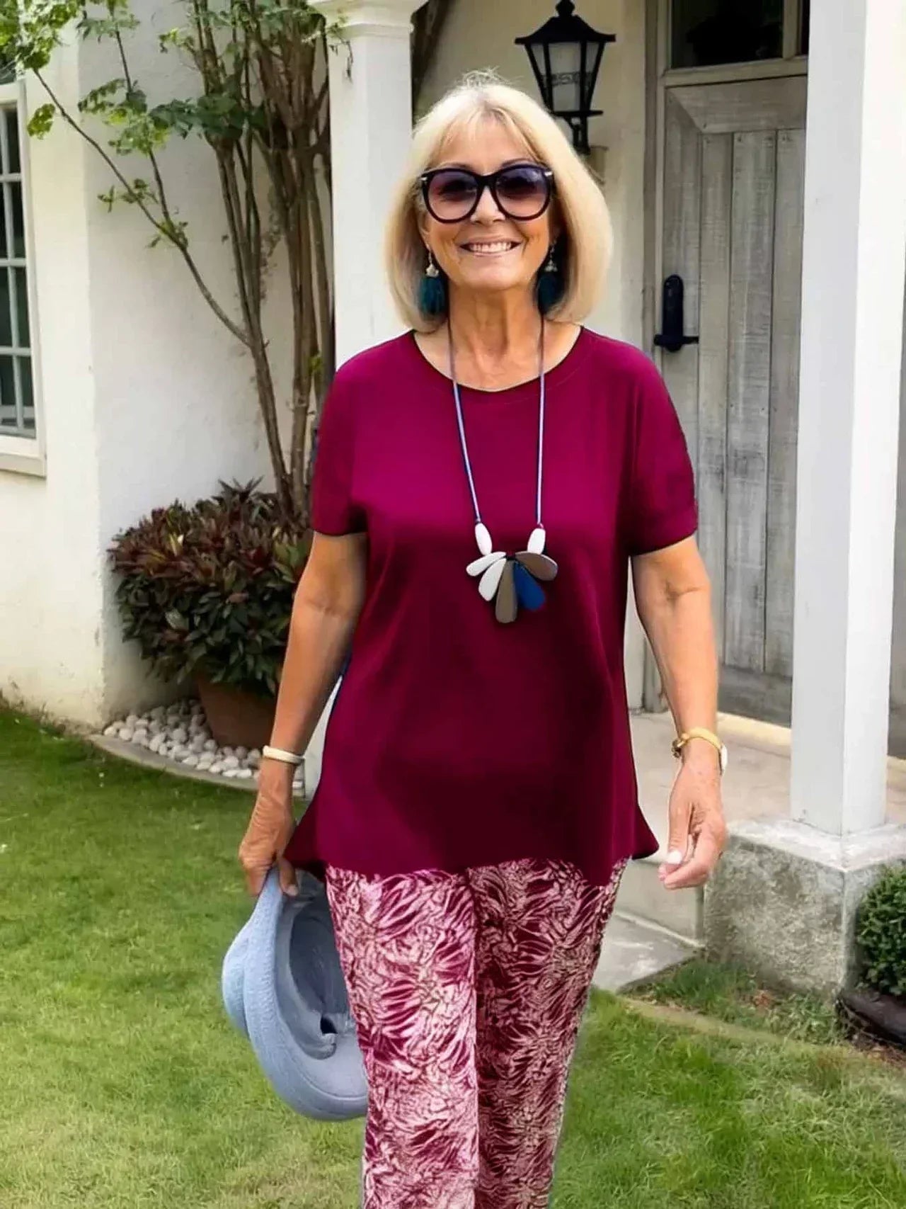 - Timeless Elegance – The combination of a fitted top and stylish printed pants creates a refined yet relaxed look.